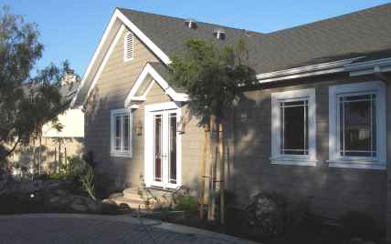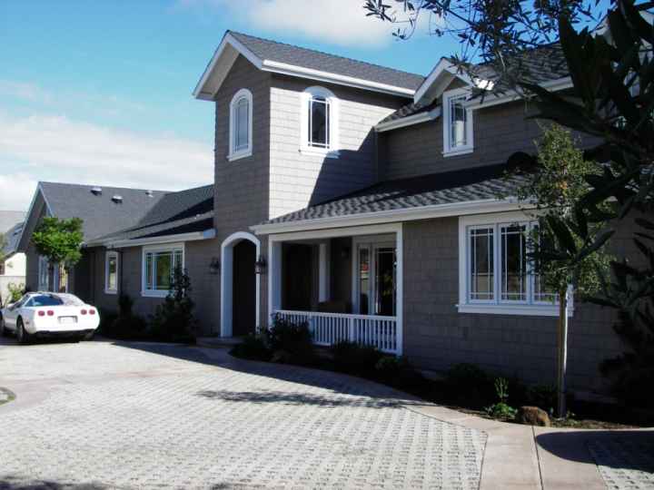 Front Exterior: The distinctive Cape Cod exterior is clad in traditional Canadian White Cedar shingles trimmed with bars-rafters and generous casing ant attention to detail.  The motor-court open-celled pavers provide abundant off-street guest parking. Sierra Pacific 9-light windows and French doors immediately betray the elegance of this beach cottage.