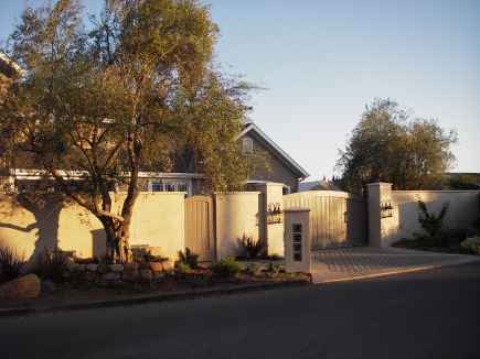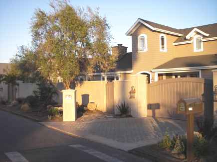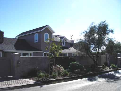 Street-side Exterior: The stuccoed masonry wall with its detailed cap provide privacy and protection.  Mature field-grown Olive trees ringed with Santa Barbara sandstone planters grace the exterior and interior court.  The video camera and key-pad in the entry pilaster provide access through the copper clad sliding entry gate and pedestrian gate.